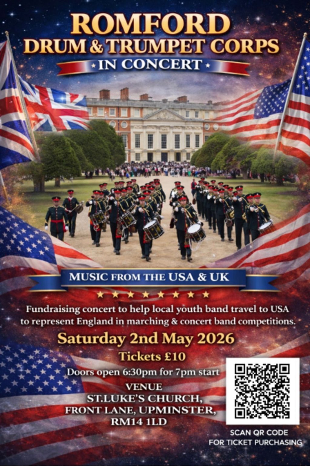 Romford Drum and Trumpet Corpa are holding a Music Workshop for brass and woodwind players (Grade 3+) aged 10-18 years, from 3-6pm on Saturday 02 May 2026 at St. Luke’s Church, Front Lane, Cranham. This will also give the young musicians the opportunity to perform with the band in the evening performance. For further details and to sign up e-mail banddirector@rdtc.org .