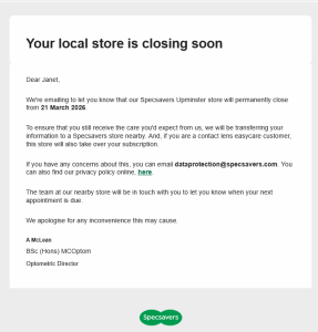 Specsavers in Upminster closing The staff at the Specsavers at 60 Station Road, Upminster have asked us to publicise that the shop will be closing permanently from Saturday 21 March 2026. By Editor on 4th March 2026 / News / Leave a comment